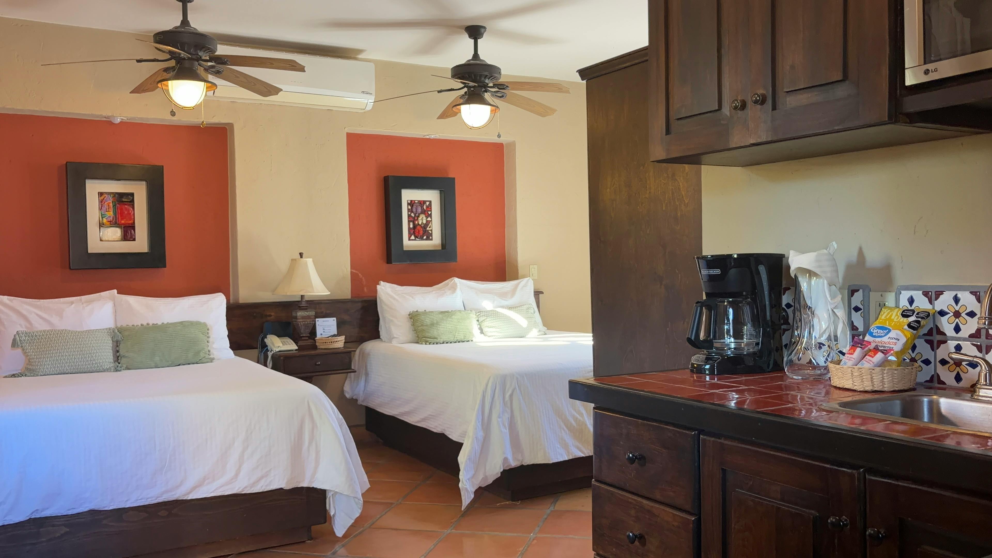 Room with two queen beds equipped with kitchenette and kitchen utensils, microwave, toaster, coffee maker and coffee kit, ironing kit, superior amenities, TV with satellite signal, Air conditioning, hair dryer, mirror Vanity with light.