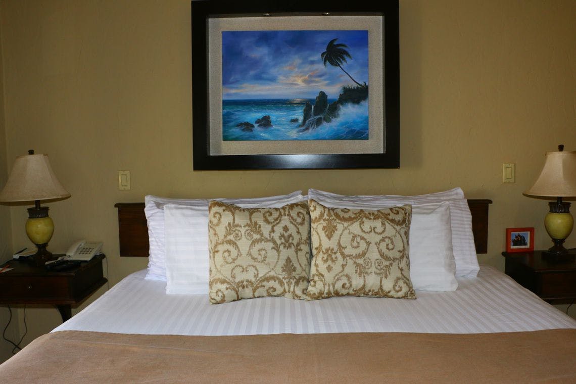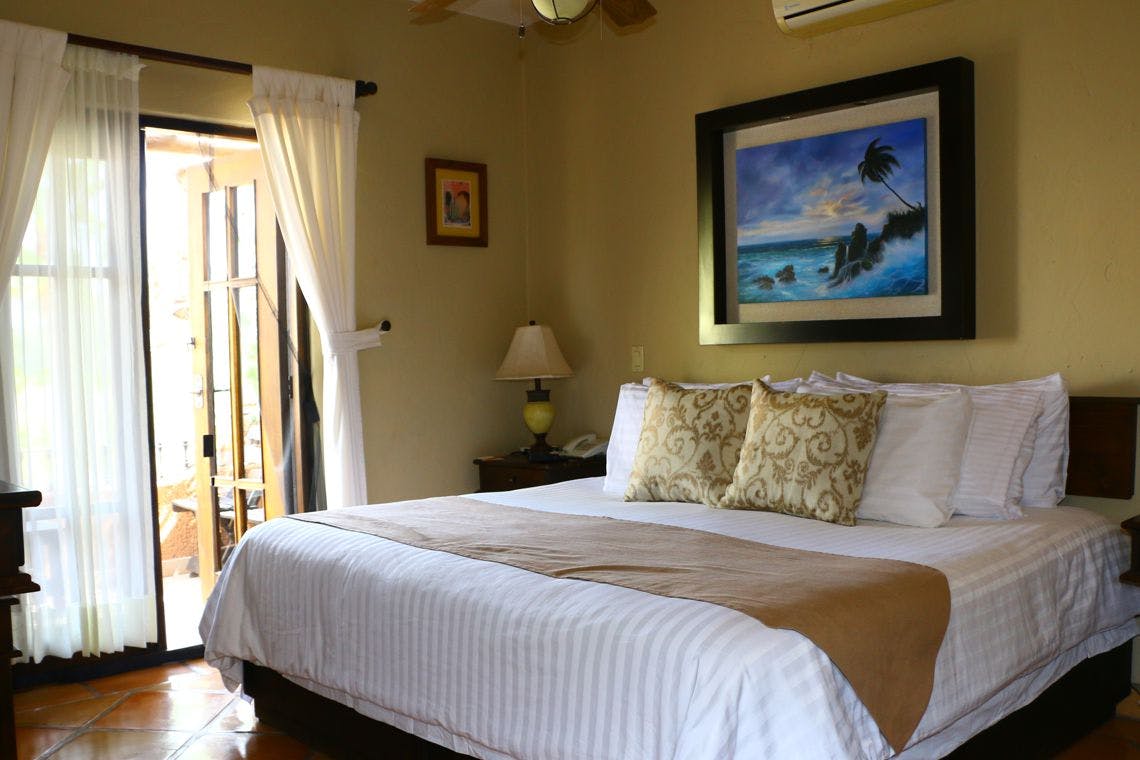 Room with a king bed equipped with kitchenette and kitchen utensils, microwave, toaster, coffee maker and coffee kit, ironing kit, superior amenities, TV with satellite signal, Air conditioning, hair dryer.